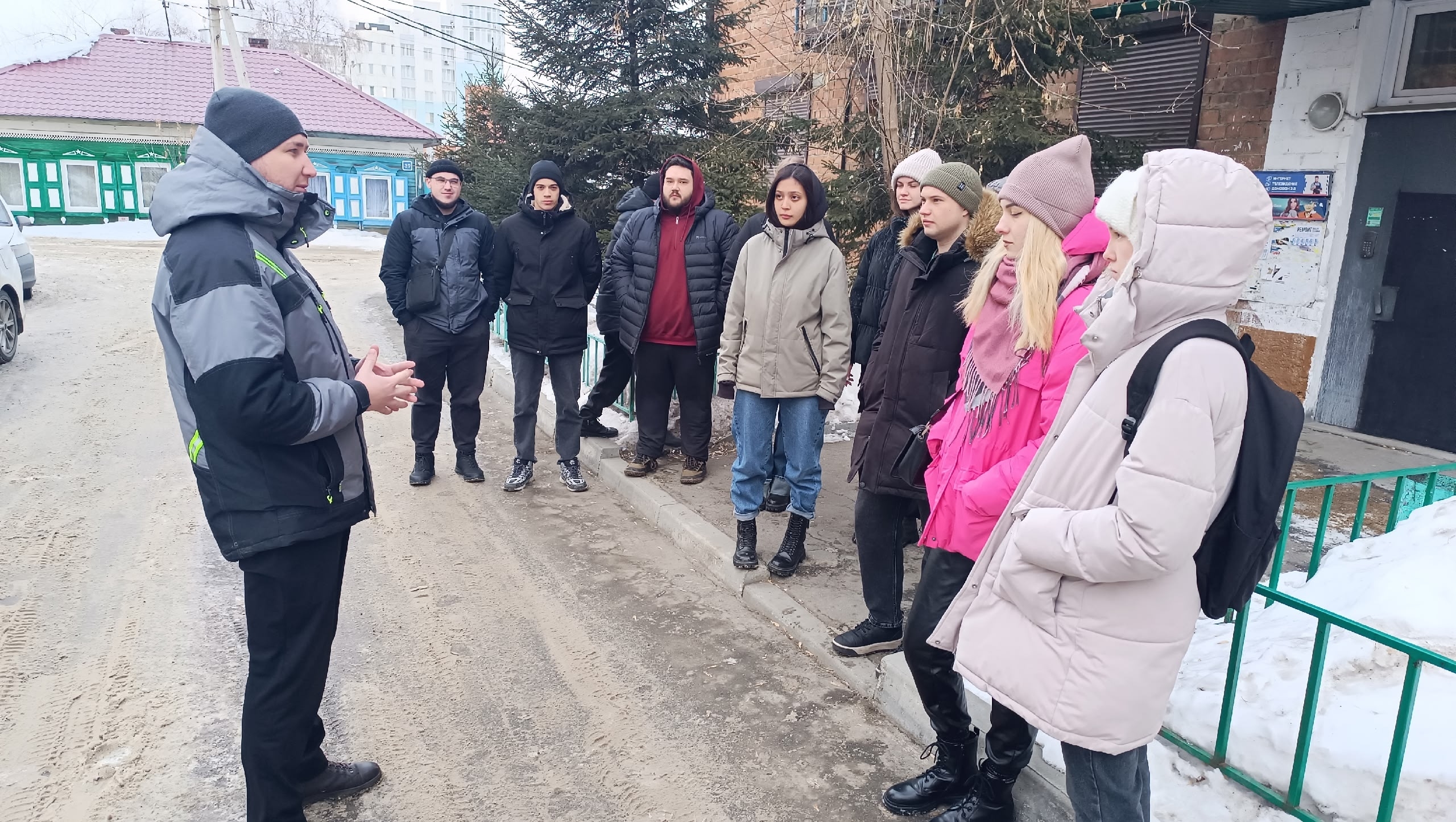 Затем теория перешла в практику: студенты вместе с сотрудниками Фонда обследовали дом по адресу: г. Иркутск, ул. Лопатина, д. 18, подробно показав студентам все этапы обследования. В ходе визуального осмотра специалисты выявили приоритетные виды работ и зафиксировали их объём для капитального ремонта.